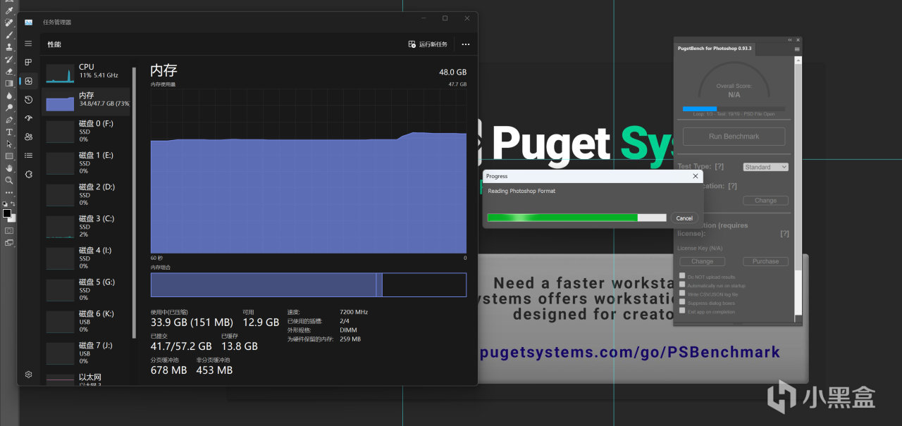 在运行PugetBench for Photoshop基准时,在大容量支持情况下,吃掉的内存甚至达到34GB