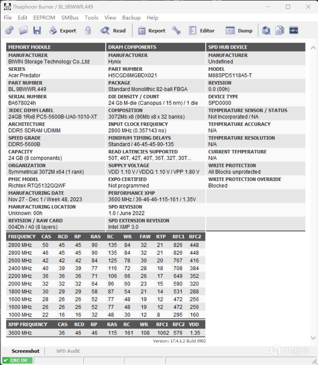 宏碁掠夺者冰刃DDR5 7200开启XMP 3.0后,可达成DDR5 7200C36-46-46-115 & 1.35V预设超频方案,高频下时序调教依然犀利,这得归功于甄选的海力士新M-Die(3Gb)颗粒,不但工作电压比A-Die更低,而且超频潜力也能堪比A-Die,内存还内置了温度传感器,PMIC不锁电压,拥有十层PCB强化用料,建议喜欢折腾的玩家都手动超频一下体验更佳。