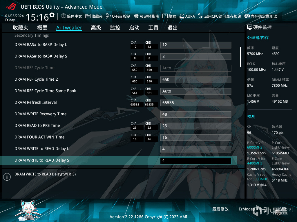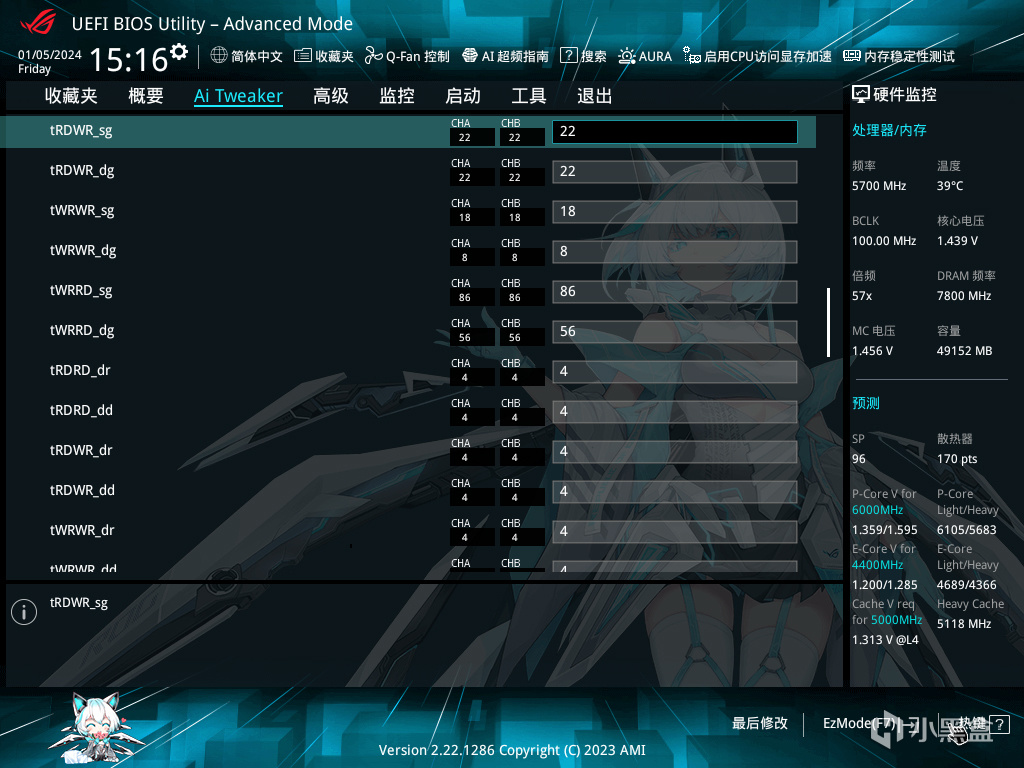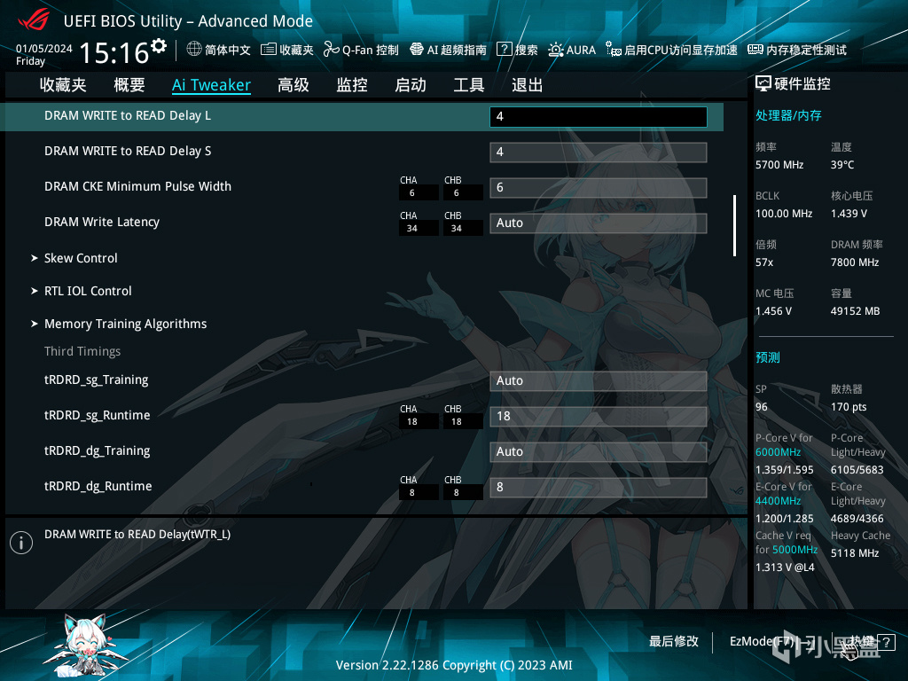 经过一天时间摸索,在当前条件下,这套冰刃Hermes RGB DDR5 7200最终能稳定的频率和参数为DDR5 7800C36-46-46-58,小参也能进一步缩紧(如上方BIOS截图),此时内存VDD和VDDQ电压为1.55V,新M-Die(3Gb)颗粒确实不怎么吃电压,显然发热量就比A-Die更好控制。而IVR(VDDQ CPU)和MCV(VDD2 CPU)电压分别是1.38V和1.46V,SA电压这颗U最佳值是1.28V,这三个电压值根据不同CPU、主板、内存频率设定是有所不同的,仅供参考。