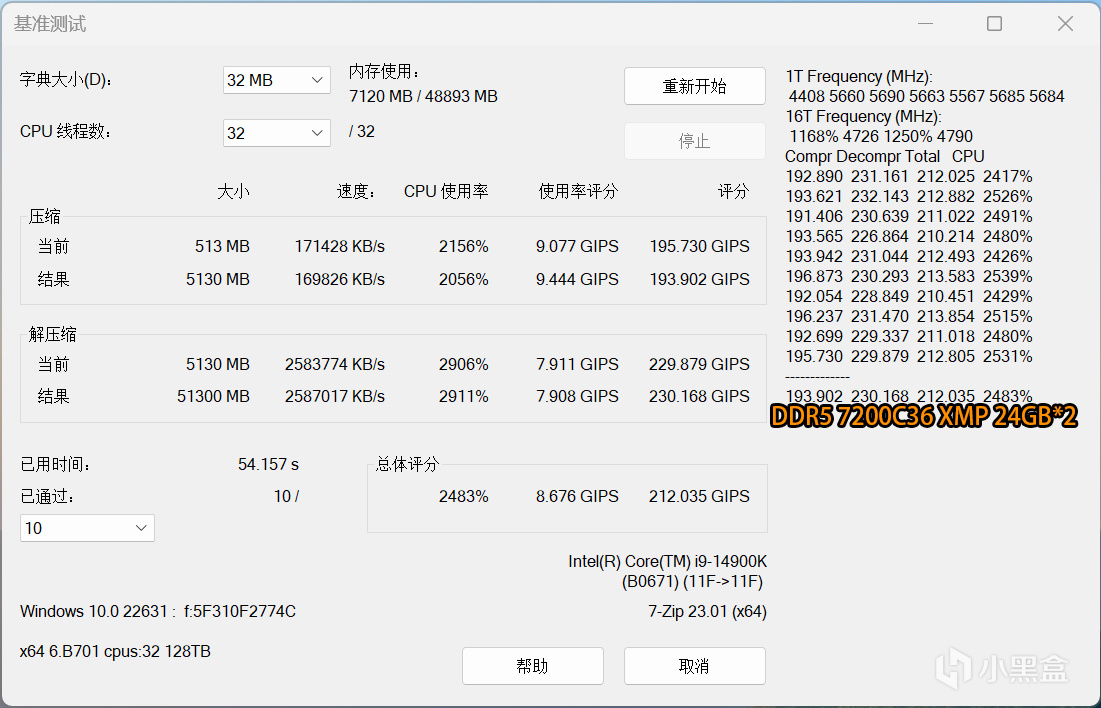 7ZIP基准测试,(2x24GB)冰刃Hermes RGB DDR5 7200C36-46-46-115 XMP设定