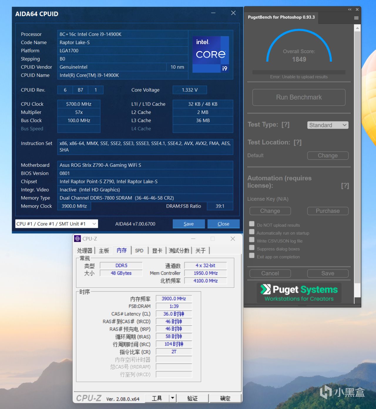 PugetBench for Photoshop基准,(2x24GB)冰刃Hermes RGB DDR5 7800C36-46-46-58 OC设定,得分1849