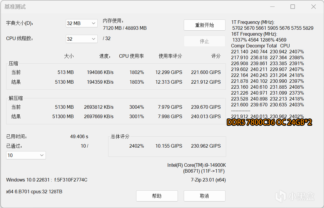 7ZIP基准测试,(2x24GB)冰刃Hermes RGB DDR5 7800C36-46-46-58 OC设定
