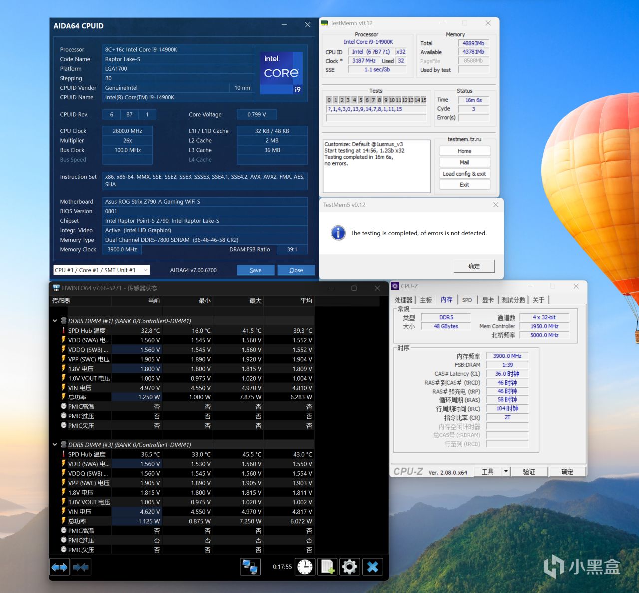 该设定下能过测TestMem5的1usmus_V3配置下三轮烤机且0错误,保证日常使用无压力,烤机时温度使用风扇辅助,裸机平台下两根内存最高温度仅41.5℃和45.5℃,内存的散热马甲相当给力,温度可是决定DDR5内存是否能烤机通过的关键元素。