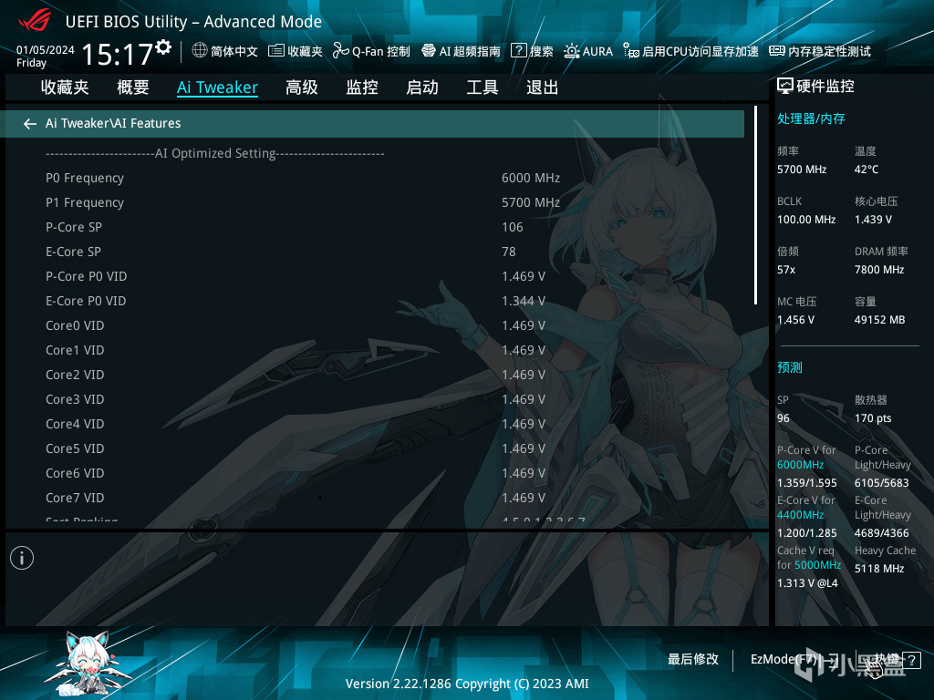 华硕ROG STRIX Z790-A GAMING WIFI S吹雪能检测CPU的SP体质分,这颗14900K总的SP分为96,大核SP为106,小核78,MC分由于不是ROG纯血主板未知,CPU大概率就是中规中矩的IMC体质,加上是四槽主板的关系,DDR5超频极限就是7800~8000MHz。