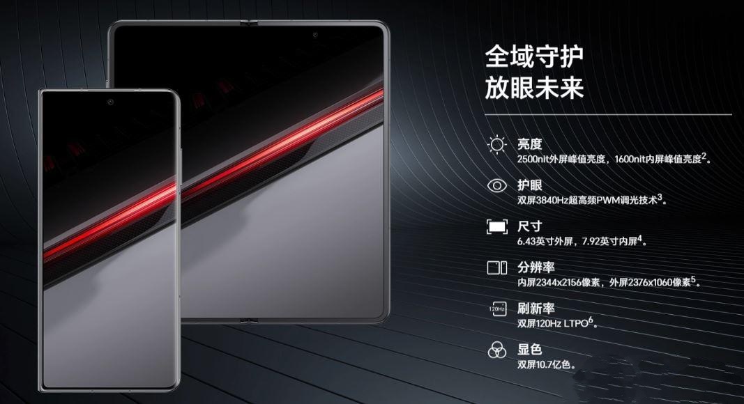②内屏:一块7.92寸2344x2156分辨率,长宽比9.78:9的OLED屏,支持120Hz LTPO高刷,3840Hz高频 PWM调光,全局最大亮度1000nit,峰值亮度 1600nit。