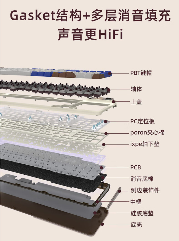 聊完轴我们聊聊结构呗,Z98青春版魔法森林采用目前键圈主流,Gasket结构加多重消音填充的模式。Z98青春版魔法森林整体用料还是比较扎实的,简单地说Z98青春版魔法森林在保证了很正的HiFi音的音色同时,整个键盘声音不会太吵,适合办公,以及住校学生使用。