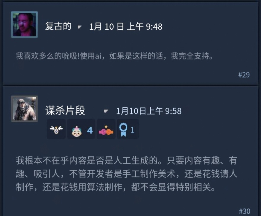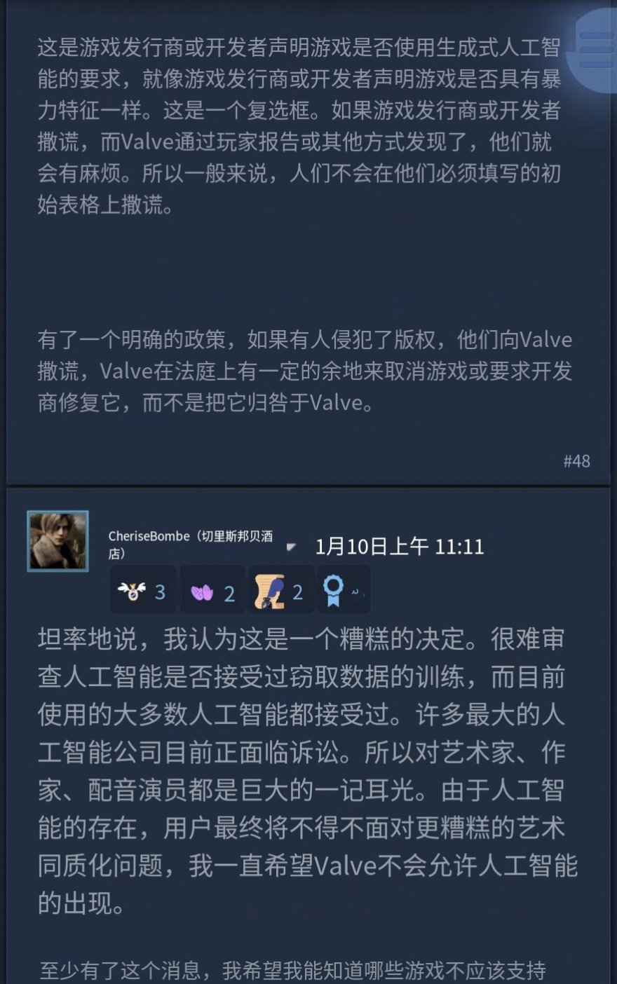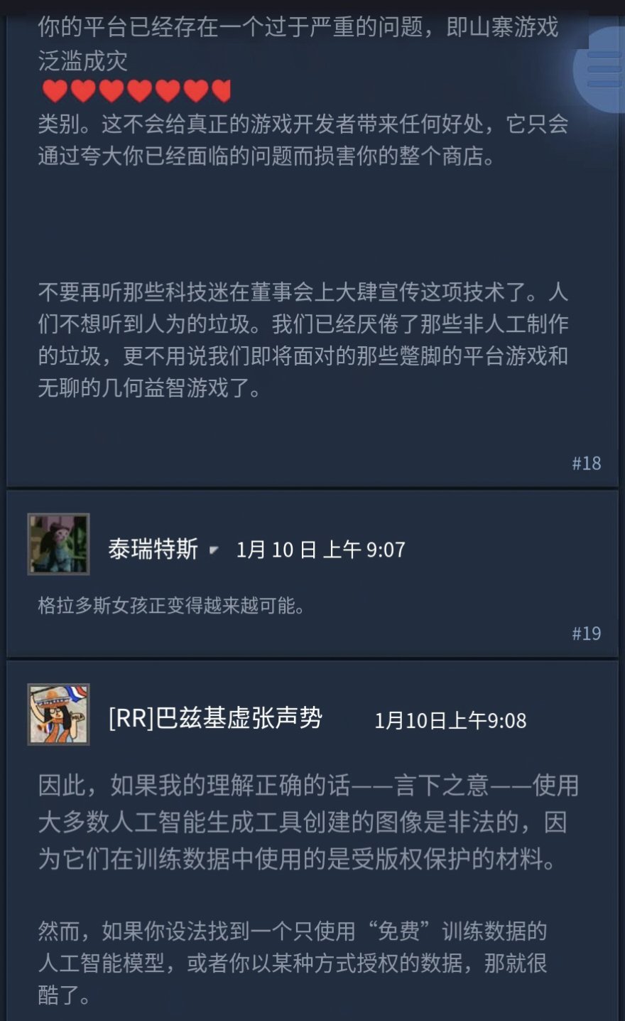 对此项政策的调整steam玩家大多数持怀疑或者反对态度,他们对steam能否准确的识别游戏有无使用AI技术表示怀疑,也有不少人希望valve能加一个筛选开关,以便他们能筛选掉这些使用AI创作的游戏。