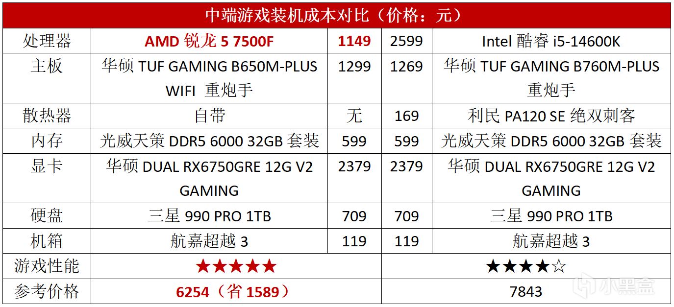 當我們分別用兩款CPU打造出性能接近的這一套遊戲配置的時候,可以看到銳龍5 7500F因爲製程更先進且沒有不起作用的能效核,所以其功耗更低:TDP僅54W,滿載功耗還不到90 W,使用自帶的原裝幽靈散熱器即可滿足散熱的需求,不用額外購買散熱器增加裝機預算。所以在其他硬件基本相同的前提下,銳龍5 7500F配置光是CPU和散熱器兩項就便宜了1000多元。