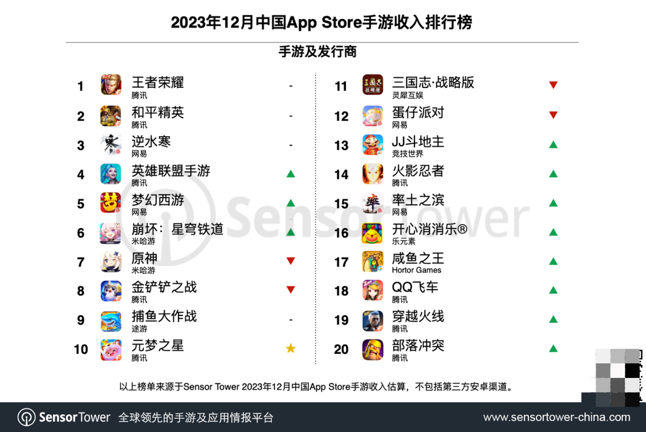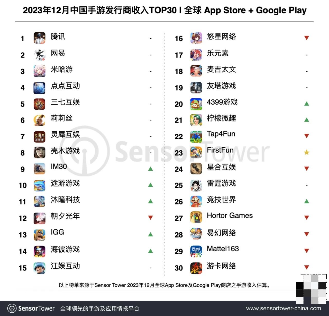 在2023年12月的全球手遊市場中,中國手遊發行商再次展現了強大的實力。根據Sensor Tower的最新報告,騰訊、網易和米哈遊三家公司位列全球收入榜的前三名,共同創造了19.5億美元的總收入,佔據了本期榜單收入的36%。