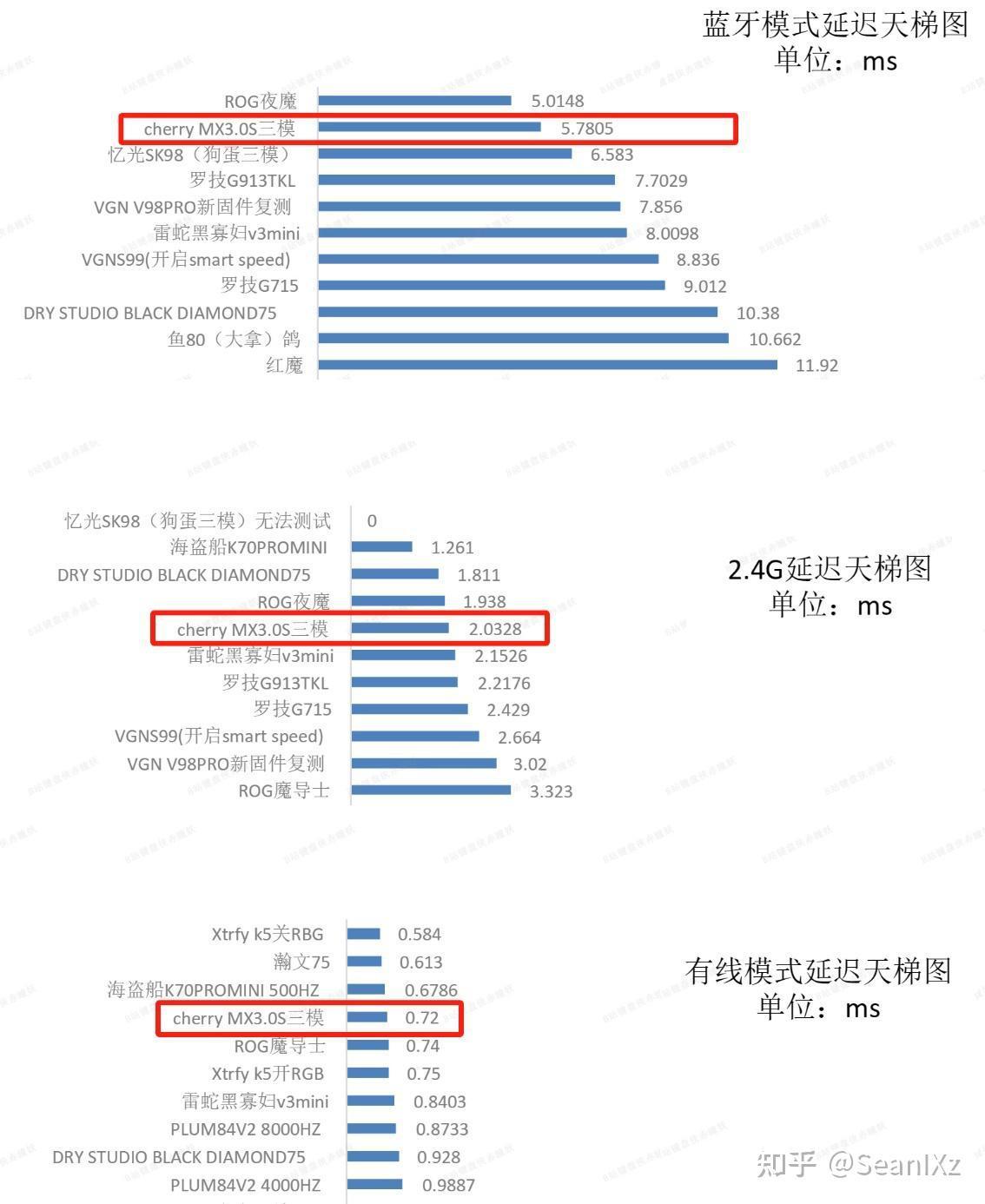 如果有关注机械键盘评测,Cherry MX2.0 S的这套无线三模方案也是业界非常顶尖的表现,有线、无线、蓝牙都处于非常靠前的T0级别,哪怕是2.4GHz无线连接的模式下的延迟性能都堪比有线连接,这才是真正意义上的无线键盘。