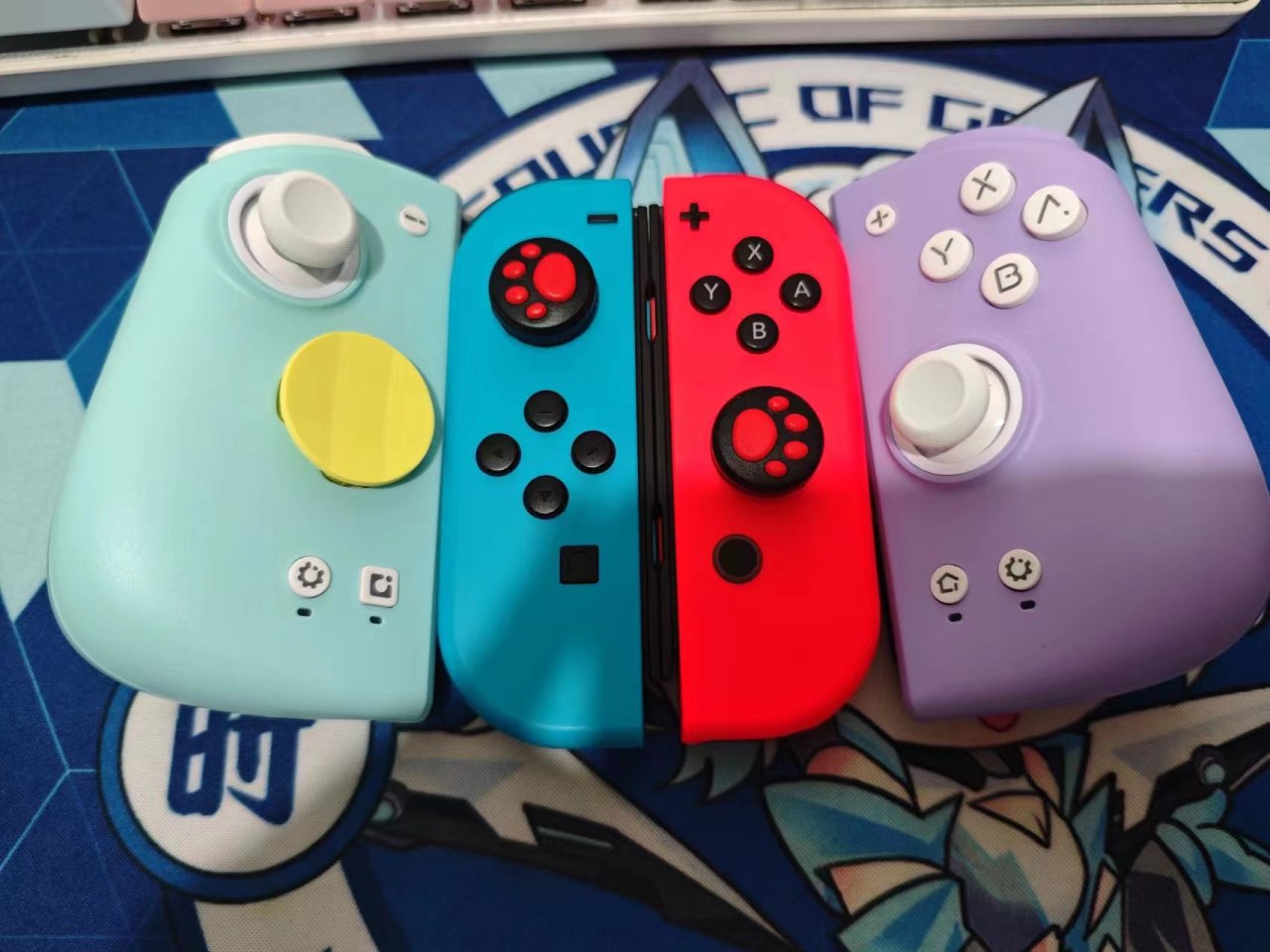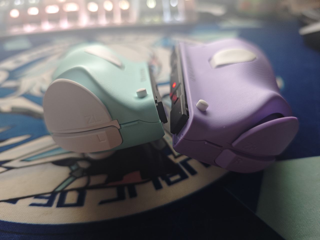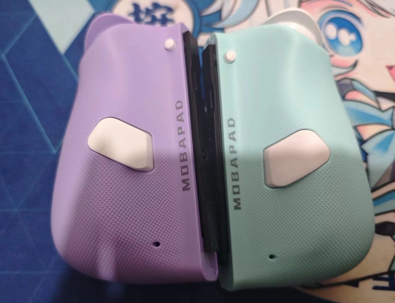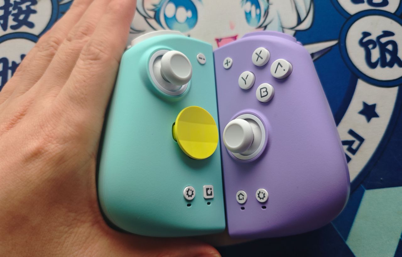 手柄配色为浅蓝色和紫色,左手柄整体为浅蓝色系,右手柄为紫色系。面盖是磁吸式,可以方便更换。