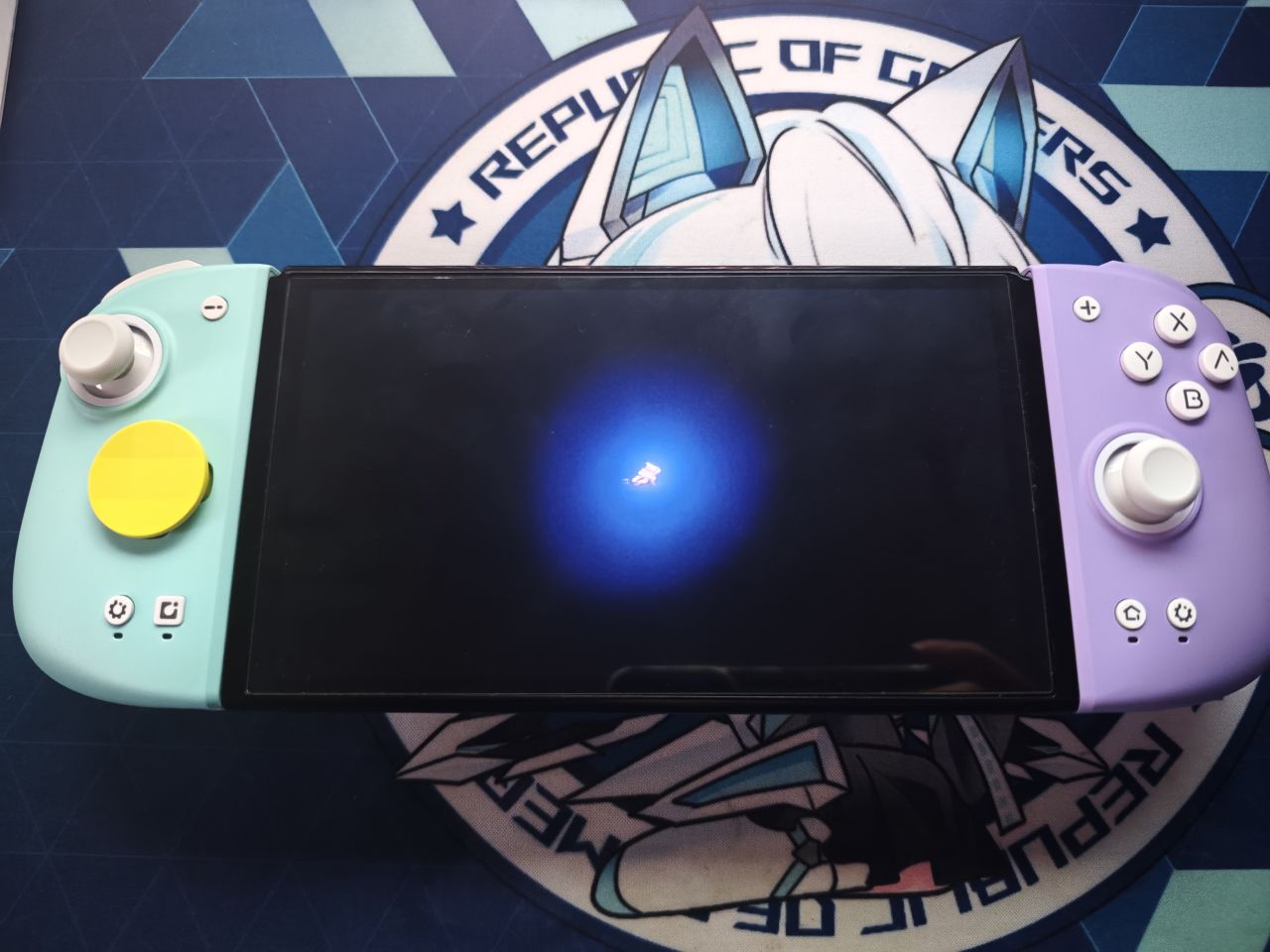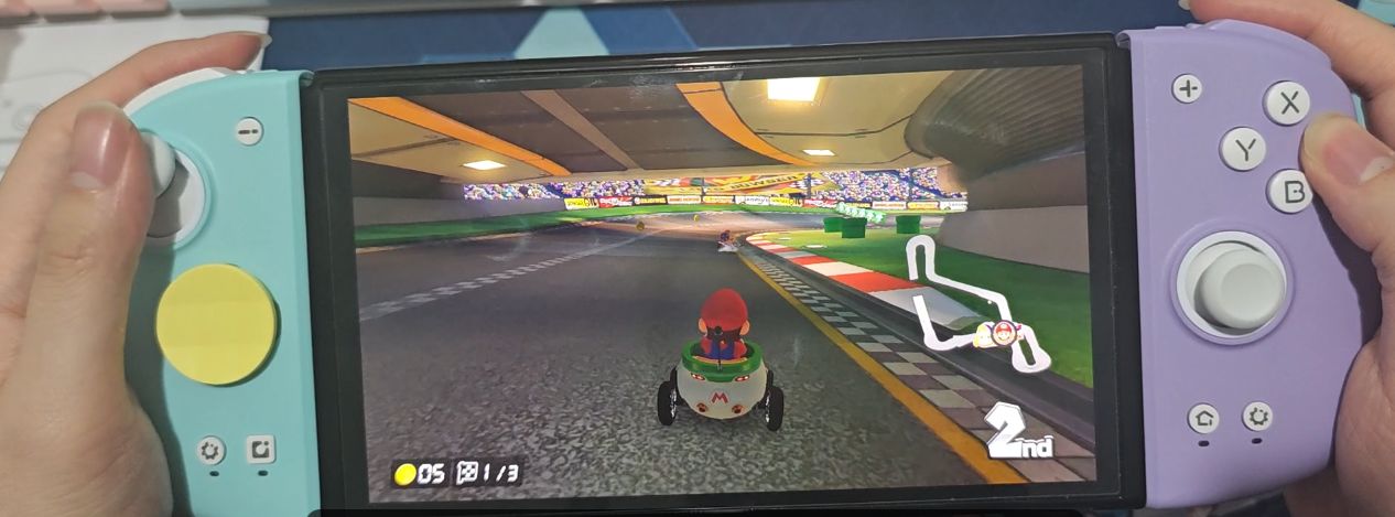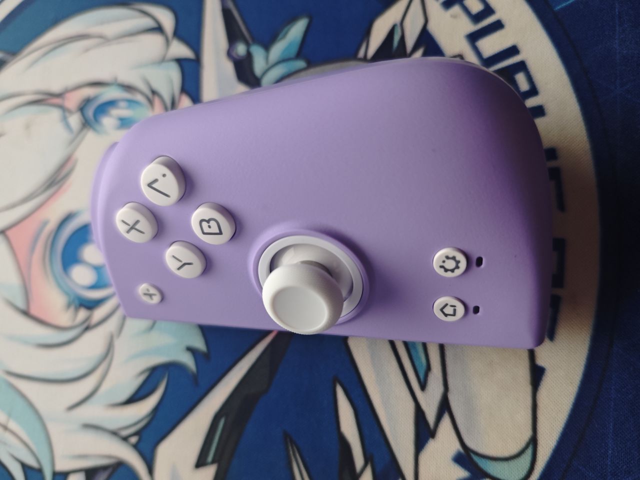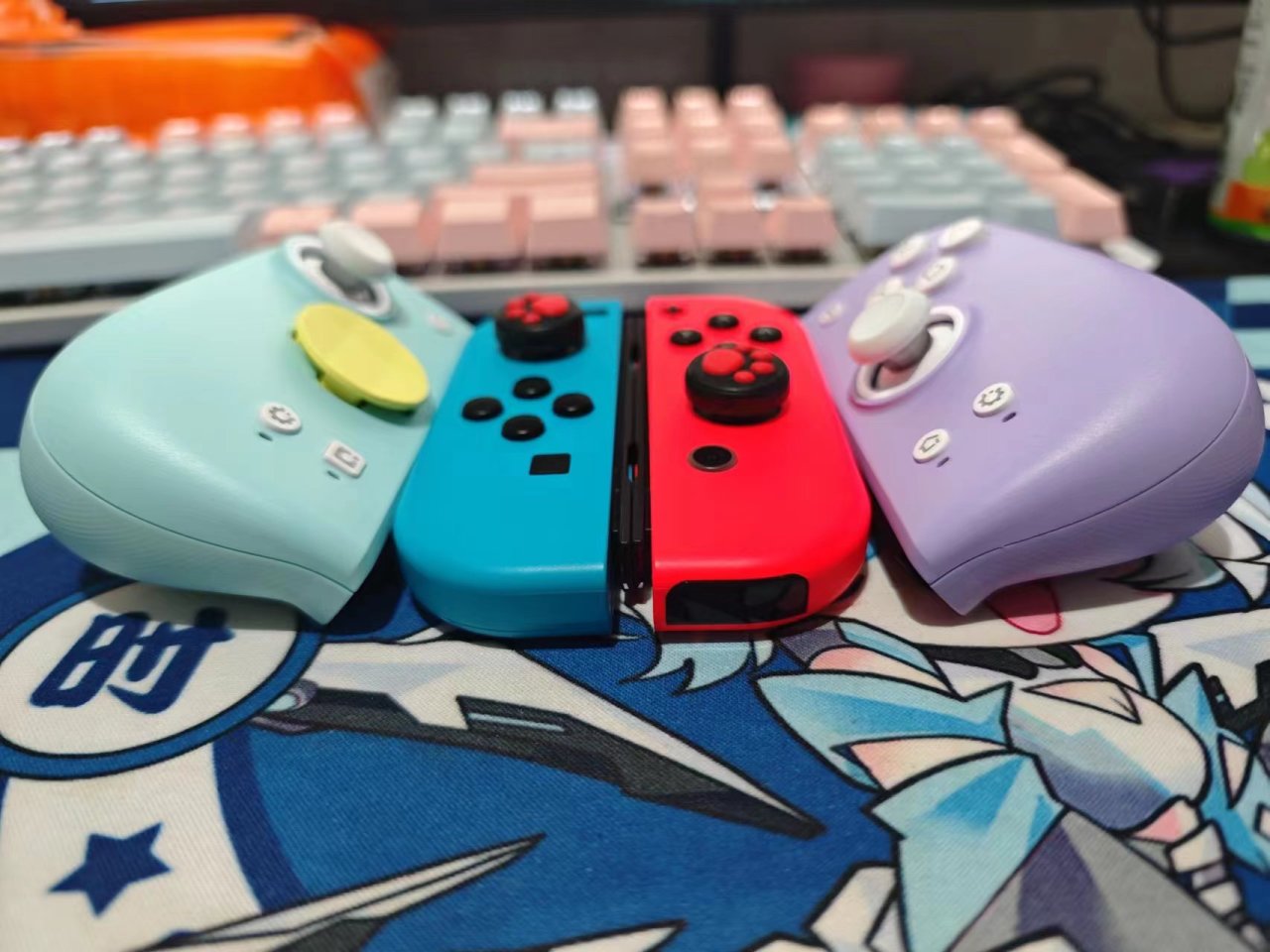 手柄配色为浅蓝色和紫色,左手柄整体为浅蓝色系,右手柄为紫色系。面盖是磁吸式,可以方便更换。