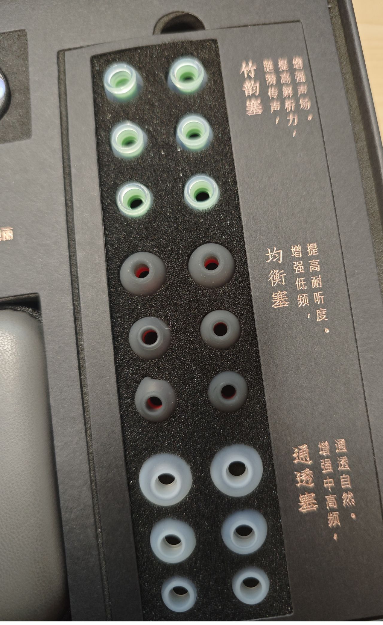 有三种不同的耳套:竹韵塞、均衡塞、通透塞,这三种耳朵都有S、M、L三个尺寸大小。