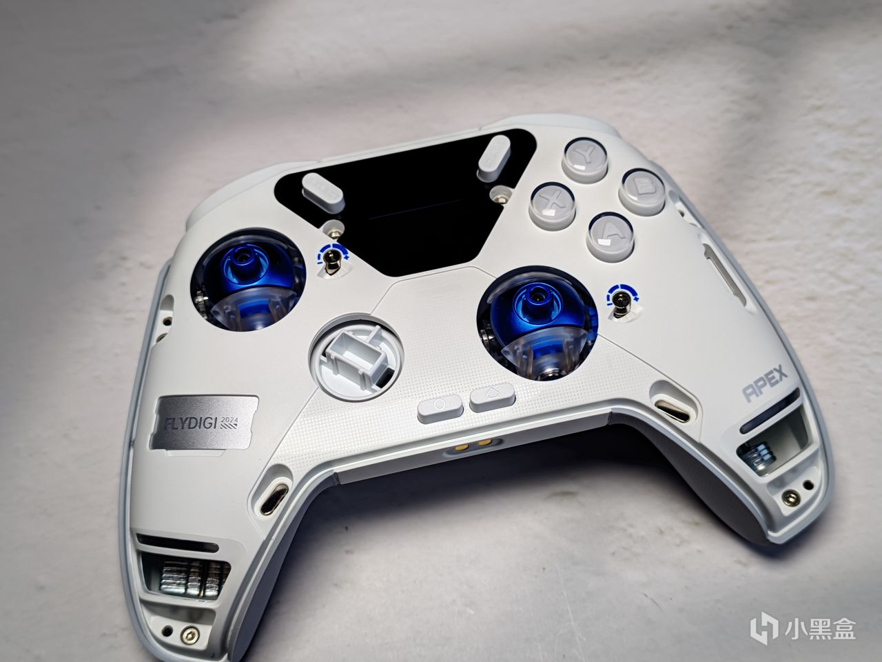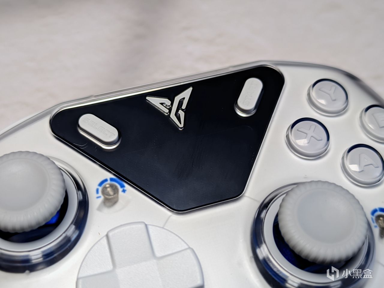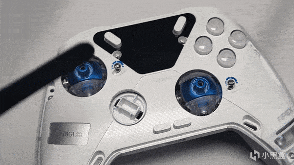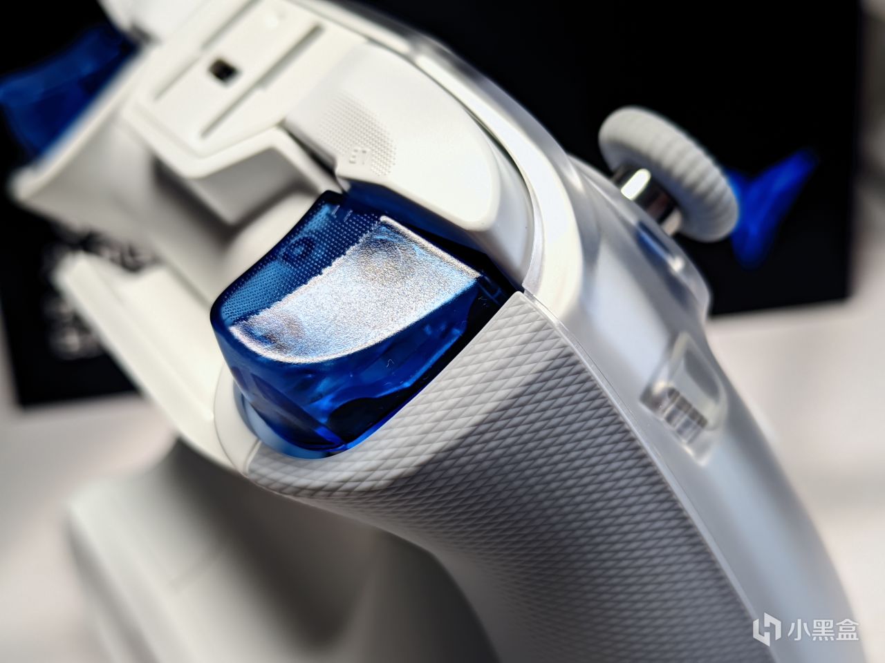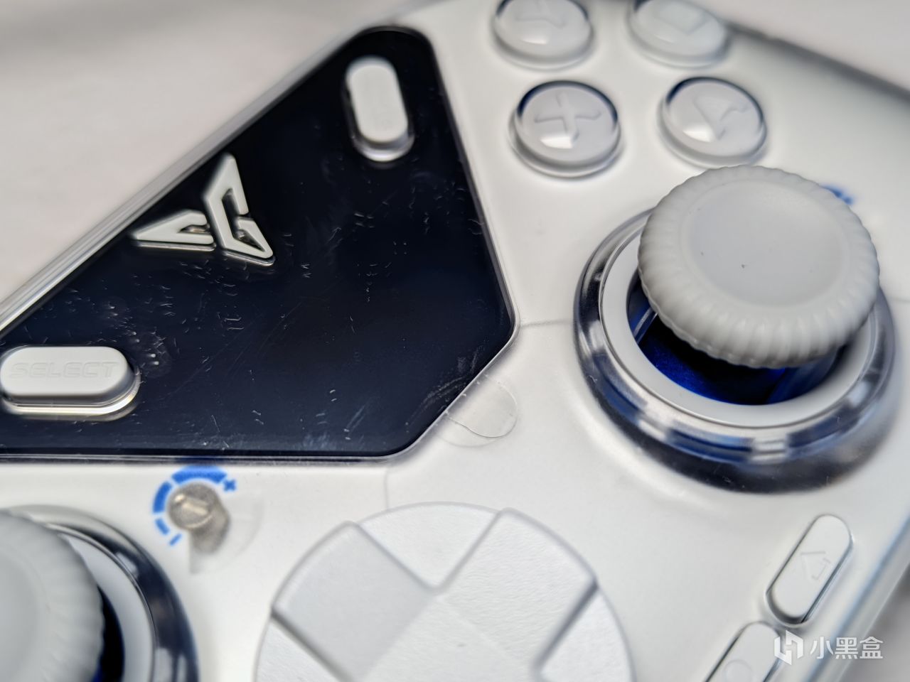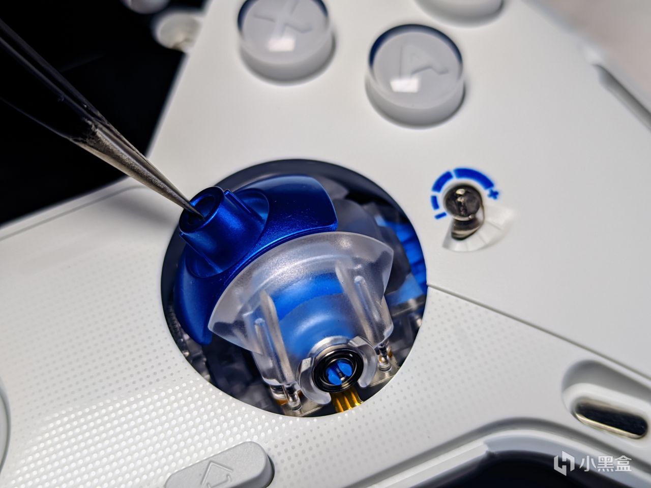 不过在整个手柄面上,最耀眼的应该就是这个力调节摇杆了,其深蓝色的外观,让人感觉非常的漂亮,通过拨动其本身的位置,也可以看到其本身的样子,可以看出其工业设计上的美感是非常高的,要比常规的霍尔摇杆好看非常多,这点也可以通过拆开自己的摇杆来确定,真的,非常漂亮。