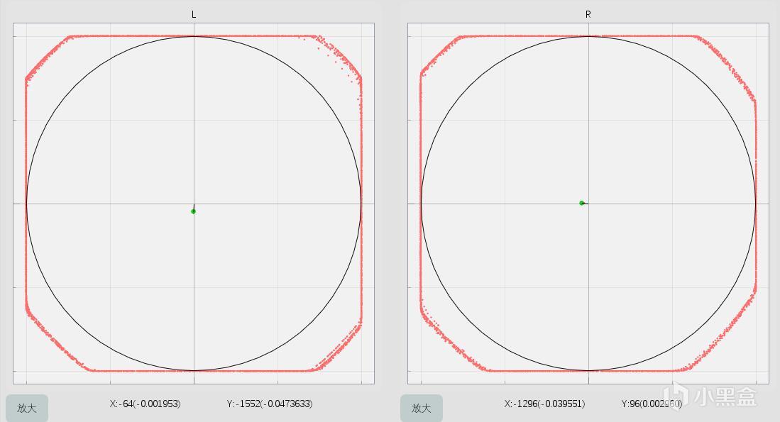 OK,进入参数表现部分,八爪鱼4的摇杆调教采用的是八边形调教,在不太准确的测试平台大概率会被识别为圆形调教,但实际上八边形调教要比方圆调教好用不少,其在对角线上的可用程度接近于方形调教,但在整体表现上又类似于圆形调教,算是比较舒服的一种调教方式,不过这种调教并不少见,所以倒也不是飞智专属。