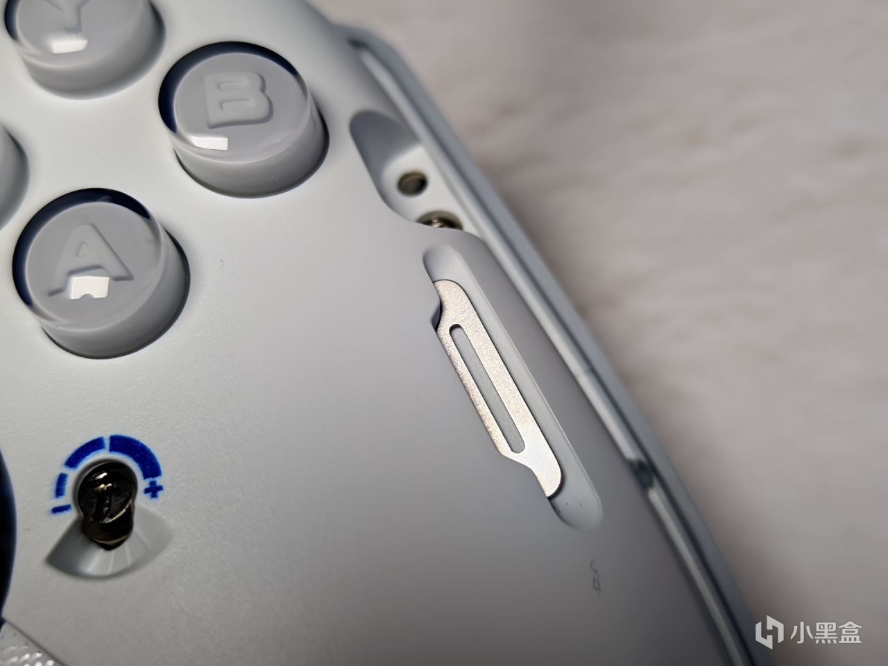 手柄的这个位置,藏有摇杆调节器,可以通过这根拨杆来扭动旁边的变阻螺丝,使得摇杆的顺滑度以及灵敏度得到改变,这点我其实之前一直当做噱头来看的,但是实际体验下来的确有着比较大的差别。