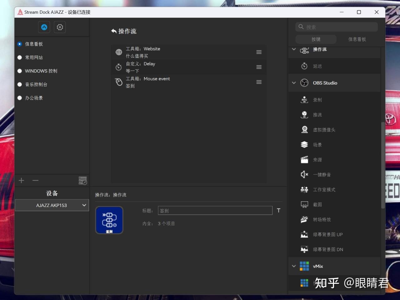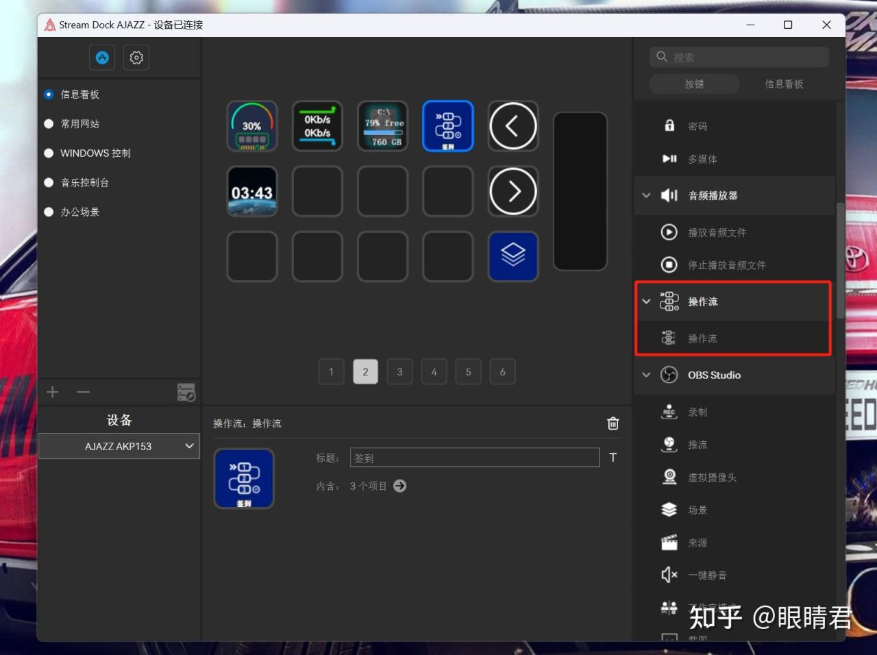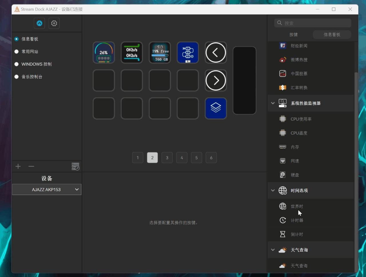 黑爵AKP153的使用主要还是通过驱动程序对按键进行个性化自定义,通过设置可以把黑爵AKP153打造成生产力设备,快捷打开各种应用或者根据使用场景进行配置等,和Stream Deck的很多功能实现主要依赖插件库一样,黑爵AKP153的驱动程序也提供了不少插件可供使用。