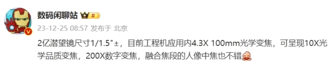 ——据了解,该长焦目前工程机应用内 4.3X 光学变焦,可呈现 10X 光学品质变焦,支持 200X 数字变焦,据称融合焦段的人像中焦也不错。