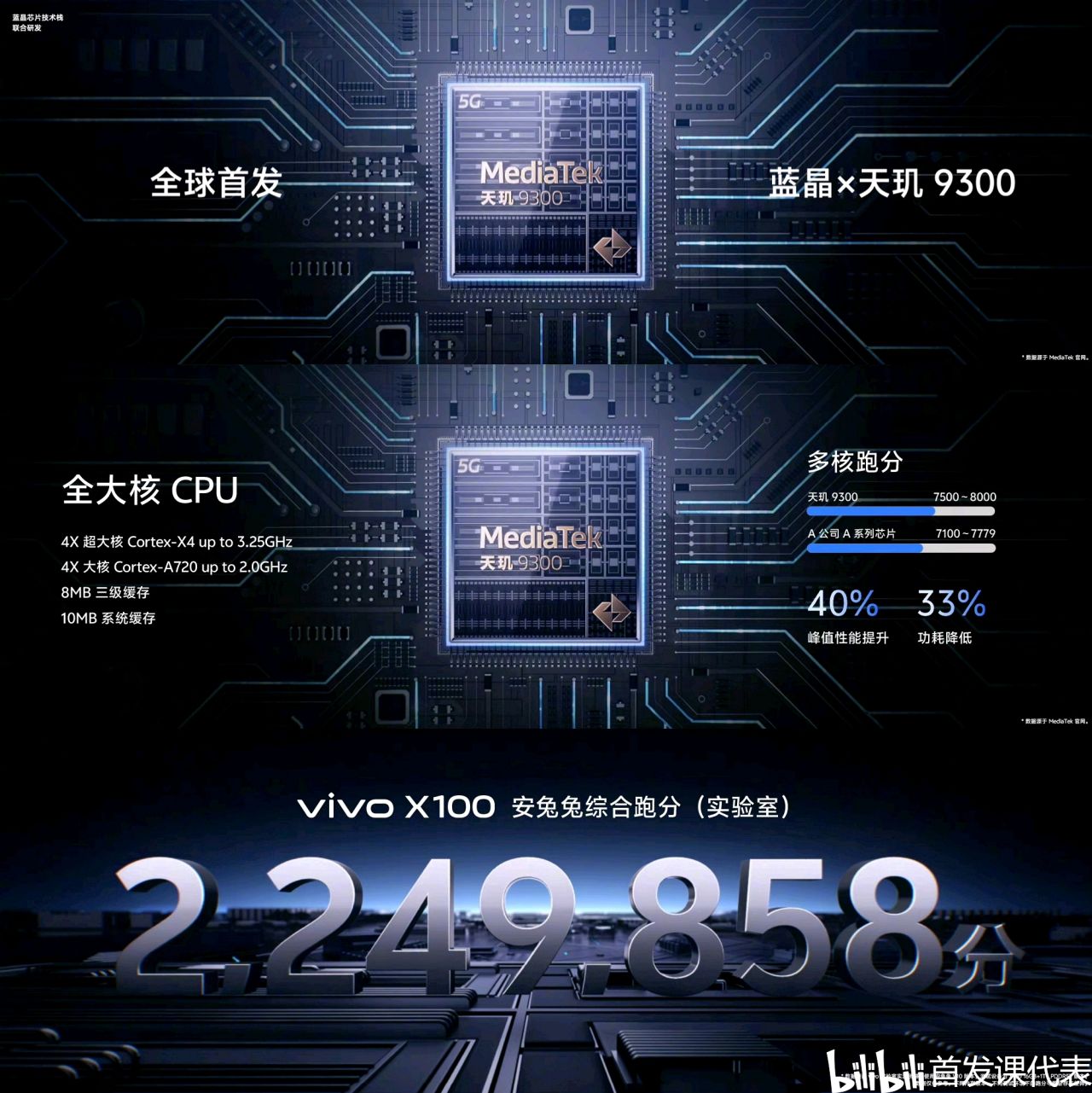◆ 处理器:首发天玑 9300,配备vivo V2 自研芯片,LPDDR5X 内存,UFS 4.0 闪存;