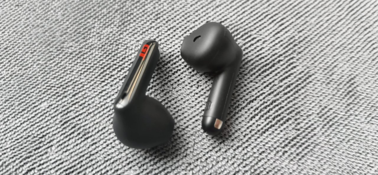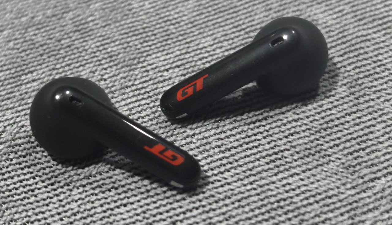 耳机取出来后你可以看到耳机柄的底部写的GT两个字,也就是耳机的型号了嘛,耳机通体黑色,单只耳机的重量也很轻,拿在手上没有任何感觉,只有3.6g,就算你长时间佩戴也并会有什么难受的现象发生,还是挺舒服的。