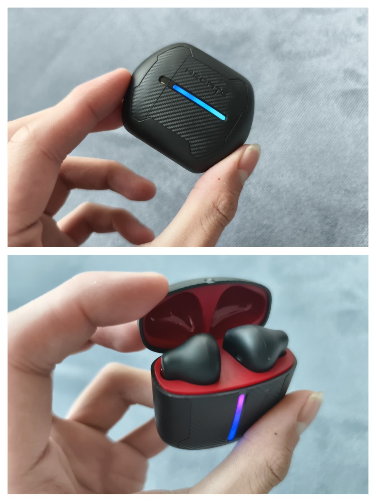 耳机仓整体是黑色的,上面印有漫步者的LOGO,正面做了不少碳纤维的纹理处理,背面则是光滑的,中间有着一条RGB灯带,灯光会不断变换,颜值方面还是较为炫酷的,打开盖子后你能看到里面的内饰是暗红色的,还是挺搭的。