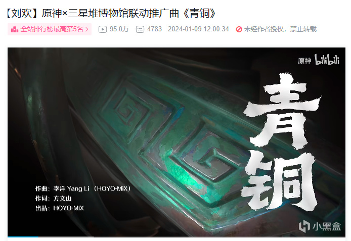 近期,《原神》通過“遊戲+文化+音樂”的方式,再次體現了除遊戲本身外的更多價值。1月9日,《原神》上線了與三星堆博物館聯動的推廣曲《青銅》,該曲目由HOYO-MiX音樂團隊製作,音樂人劉歡演唱、作詞人方文山賦詞。從詞作者和演唱嘉賓來看,該曲目絕對算的上是重量級作品。