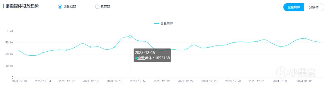 據熱雲數據顯示,相較於去年12月,開年後遊戲行業整體投放的創意組數在持續走高。(注:12月15日爲騰訊《元夢之星》公測首日)