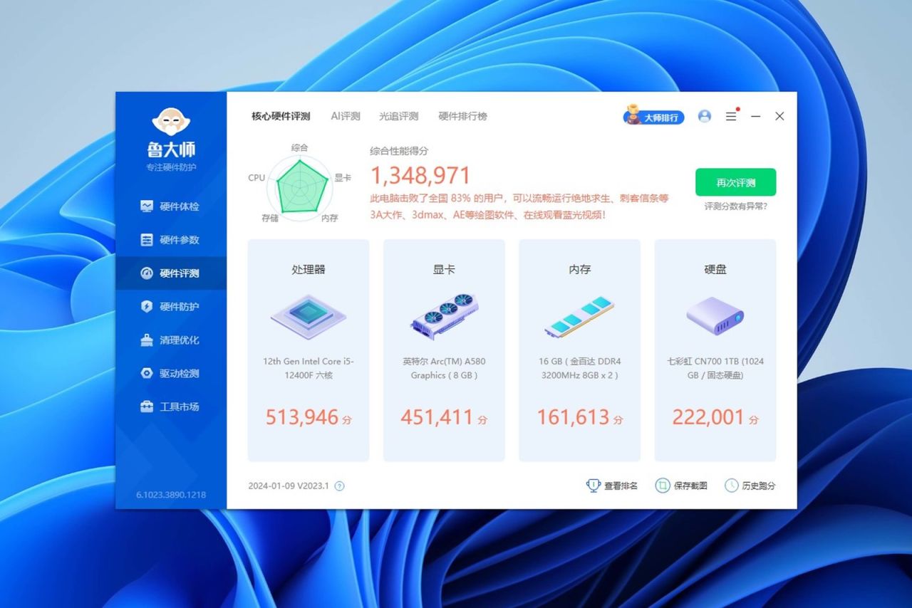 接下来做一下跑分测试和应用测试,调试配置为开启内存XMP+性能模式+显卡超频20%,大家应该能对这套设备的机能有更清晰的了解。