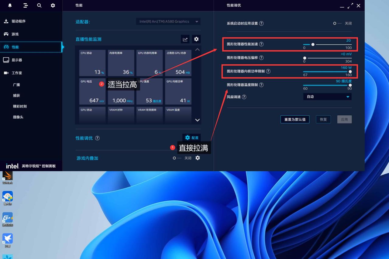 显卡安装完成后重启电脑,按Alt+i快捷键进入显卡控制面板,依次点击性能→性能调优的配置,修改以下两项: