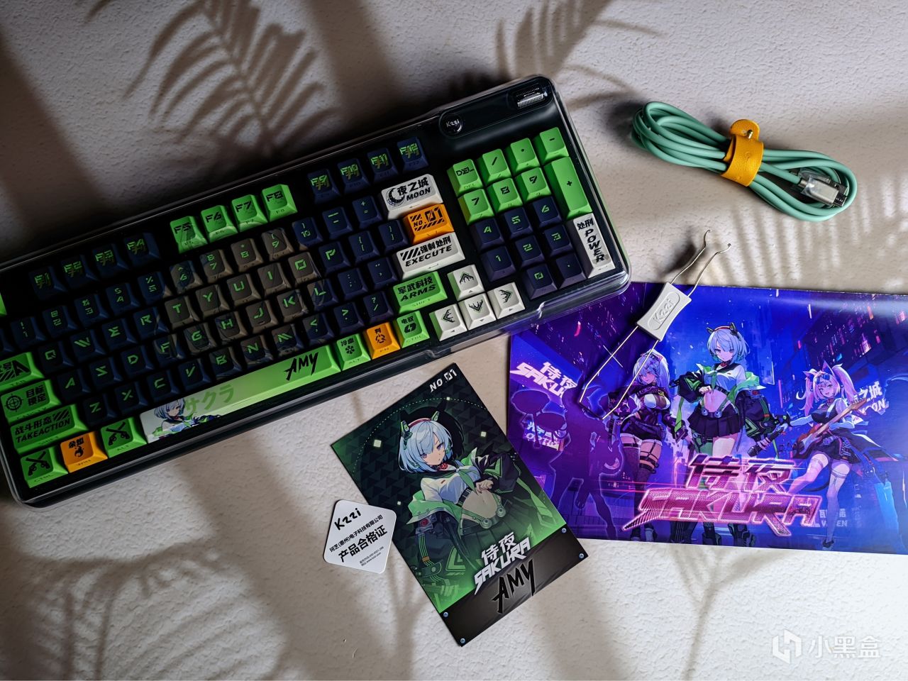 因为Z98的祖传套盒多少有点画风不对,这边就不做展示了,全部的产品内容如上所示,一张集换式卡牌-AMY,一本画册,一个拔轴拔键器,一根与IP颜色搭配的浅绿色数据线,合格证以及剩下的本体及附带的防尘盖了,内容物还算比较多的,可惜没有附带替换轴体,算是有些遗憾了。
