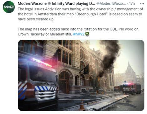动视与“布伦伯格饭店”多人地图原型的阿姆斯特丹音乐学院酒店就法律方面的问题似乎已经解决,地图已重新添加到CDL地图轮换中。
