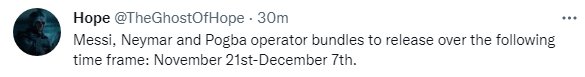 梅西、内马尔和博格巴的人物组合包会在11月21日~12月7日期间上架。