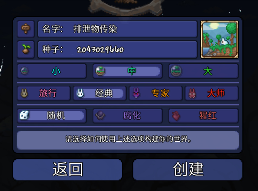 世界創建完畢後,下面有5個選項,除了第四個是複製遊戲種子外,其他四個跟角色下面的是一樣的。