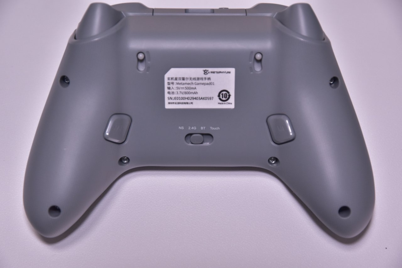背部的扳机锁为两档调节,短行程轻轻一按就能实现长行程按到底的效果,两个背键为微动按键,手感偏软,另外还有一个切换开关用于在NS/24G/BT/Touch模式之间切换。