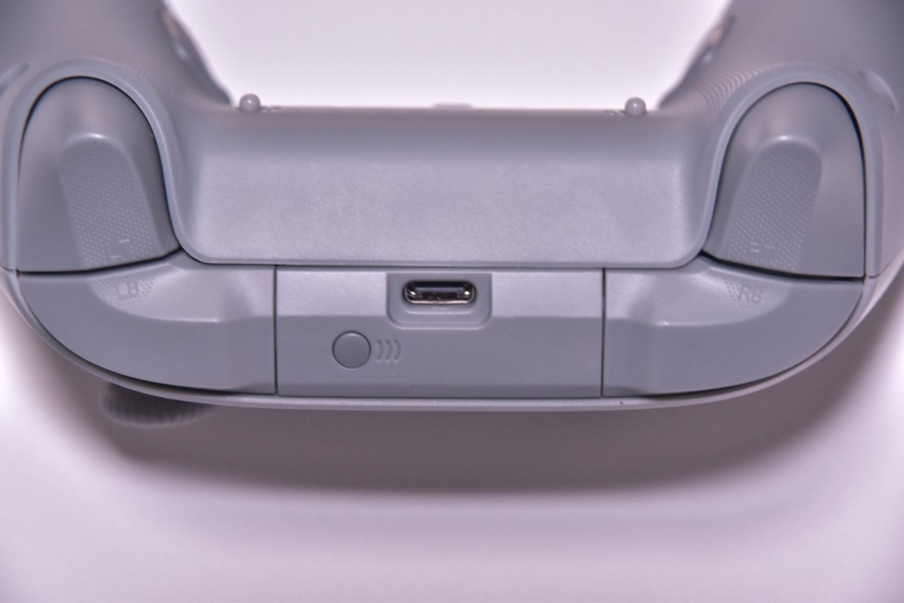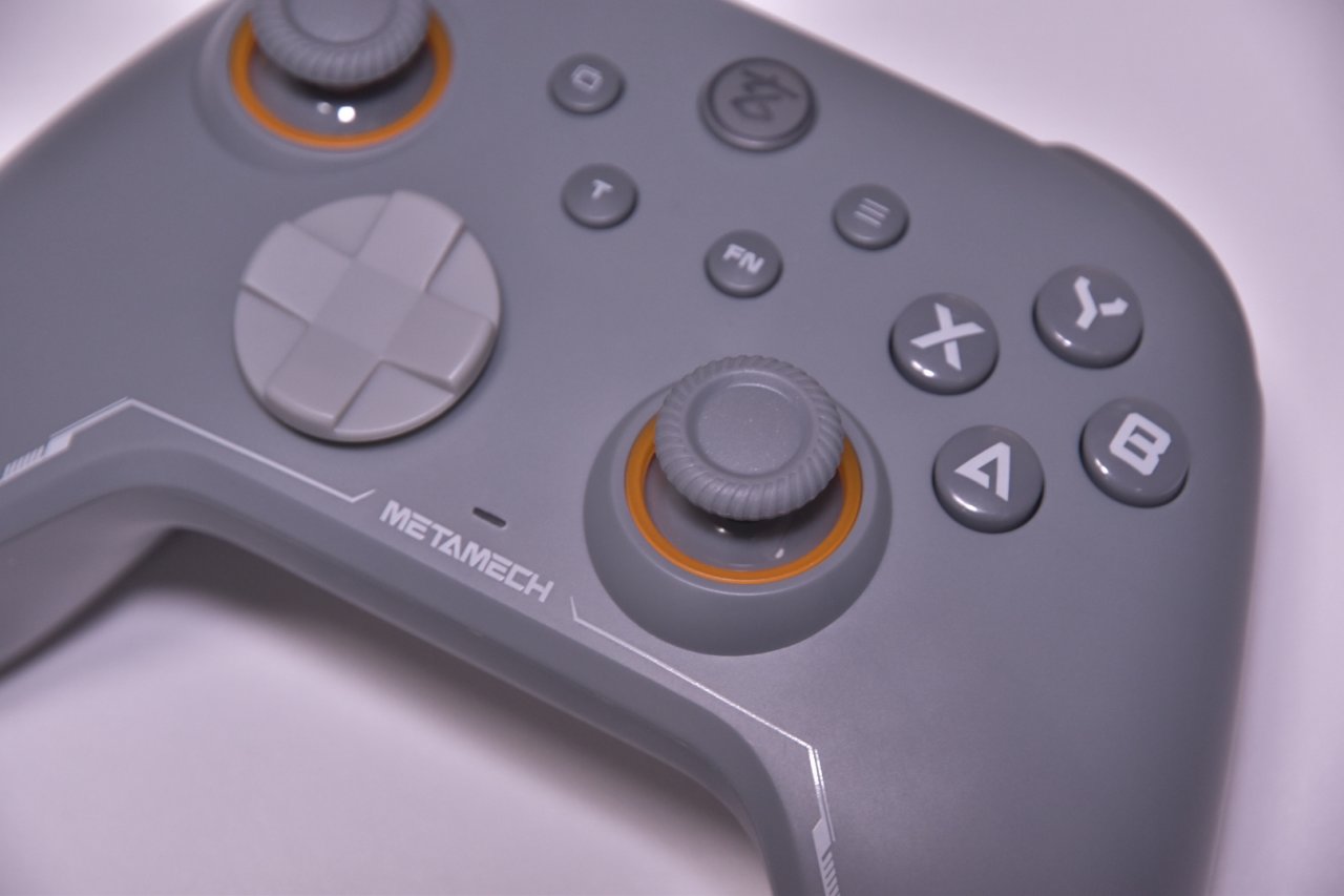手柄为灰色配色,正面下方有白色线条点缀,摇杆的橙色灯环十分亮眼,除了常规的按键外,正面还有一个t键一个fn键,用于设置连发、调整陀螺仪等,比较方便的是,可以通过按住select和start一秒来切换有无/死区模式。