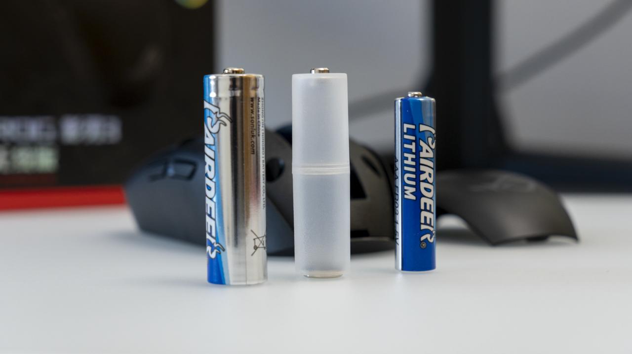 这次在包装盒里的附件ROG也是用心了。虽然这次没送替换脚贴,但是送了两节不同规格的电池,还送了一节AAA(7号)电池转AA(5号)电池的转接套,省去了你自己买的麻烦。