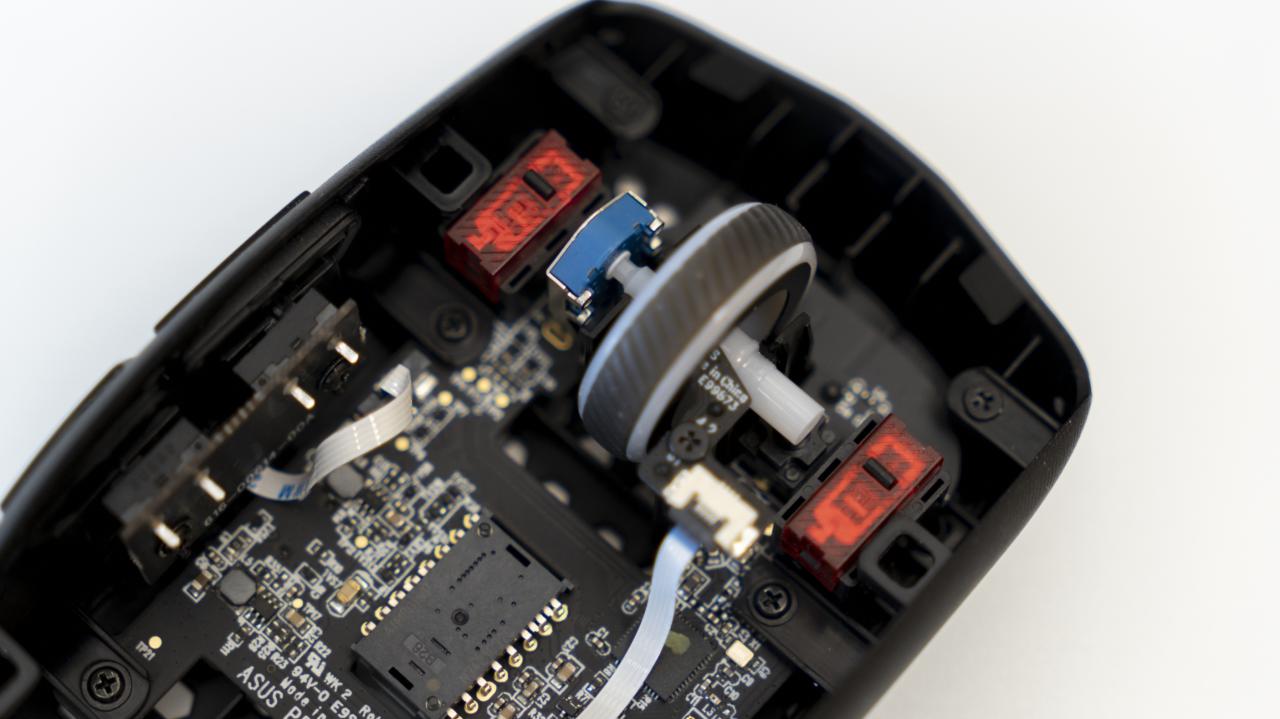 原装微动依旧是ROG自研的镀金透明红,7000W次寿命,手感硬脆。