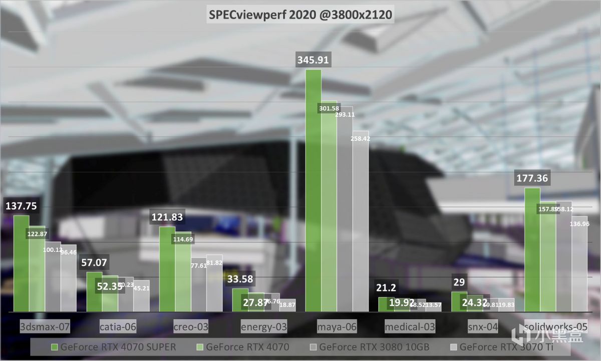 SPECviewperf特点是可测量在OpenGL和Direct X API下运行的系统的3D图形性能,专业软件包括3dsmax、Catia、Creo、Energy、Maya、Medical、SNX、Solidworks,凭借着几乎完整的AD104核心,GeForce RTX 4070 SUPER表现出的常规性能也非常突出。
