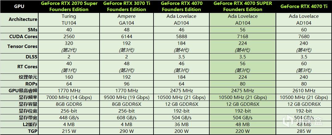 更确切的说,GeForce RTX 4070 SUPER是当下最有机会进入教科书的产品之一,同样是基于AD104打造,但核心数量已然向GeForce RTX 4070 Ti靠拢,包括7168个CUDA Core,224个第四代Tensor Core和56个第三代RT Core,重点是L2缓存一步拉满至与GeForce RTX 4070 Ti相同的48MB,诚意已然拉满。