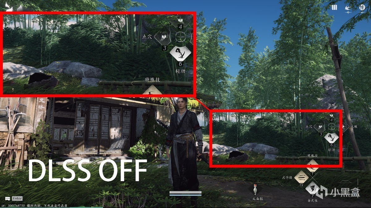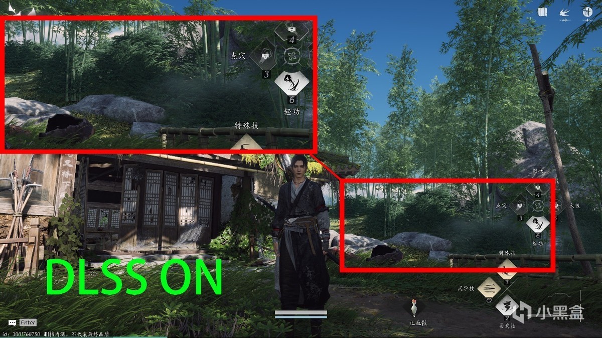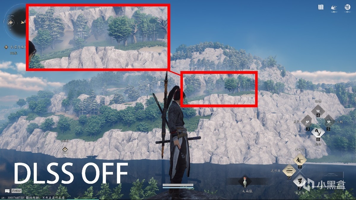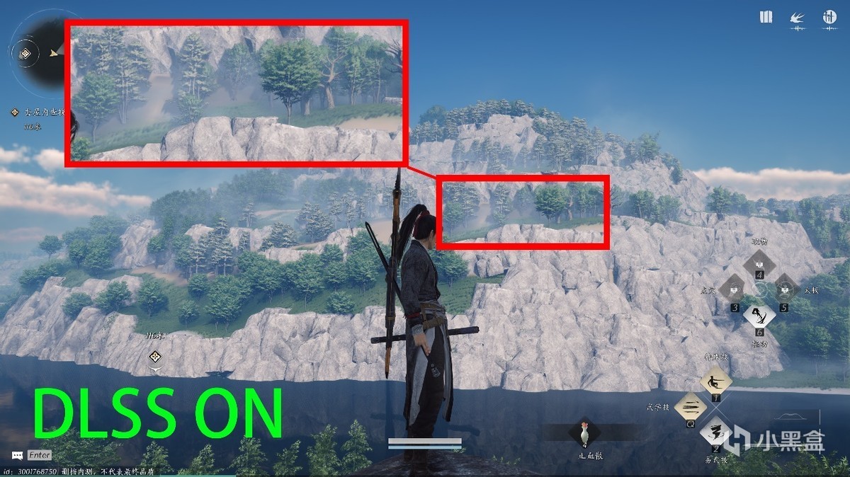 先说画质,这里远处山林在柔雾下光影的细节处理,DLSS 3开启之后过度变得更为自然。