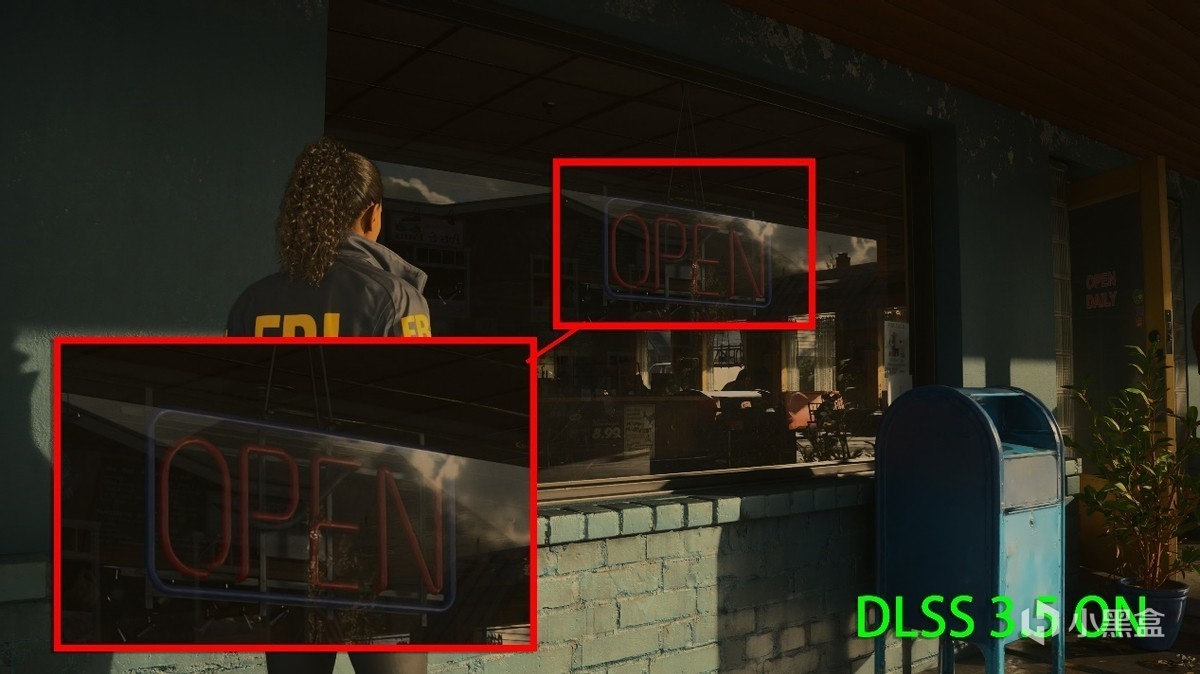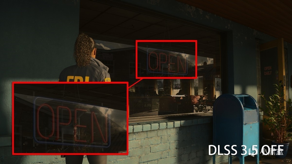 另外在《心灵杀手2》也能够明显感受到DLSS光线重建带来质的变换。以第二章节开始的咖啡厅橱窗为例,如果关闭DLSS 3.5,就会在玻璃上看到明显的噪点,窗户内人物衣服的二次反射,也不会投影到橱窗中,缺少了真实玻璃通透的质感。