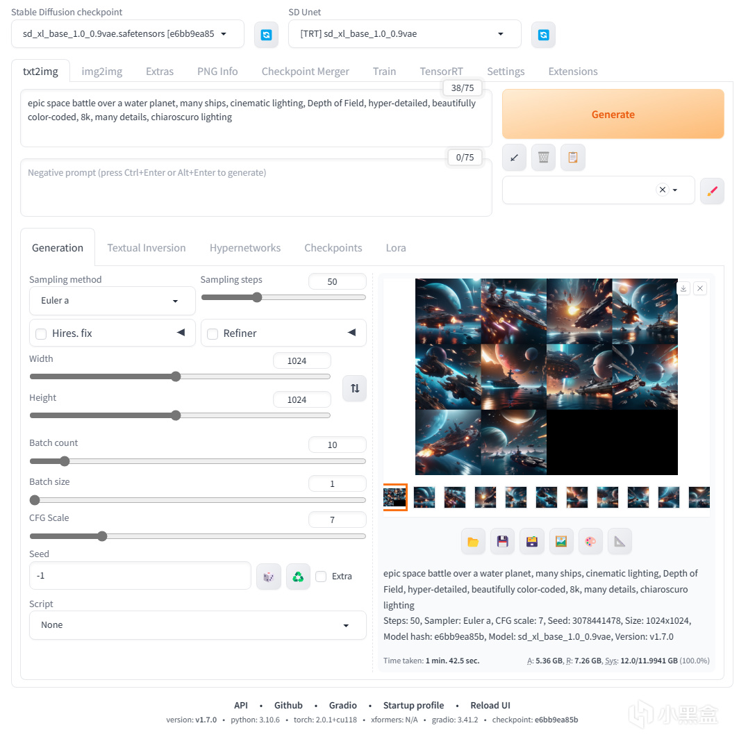 在配置完Stable Diffusion Web UI + TensorRT之后,这次我们用更短的语言描述生成10张分辨率为1024x1024的星际航行图片,每次运算1张图片,即总共执行10次,采样步数设置为50。