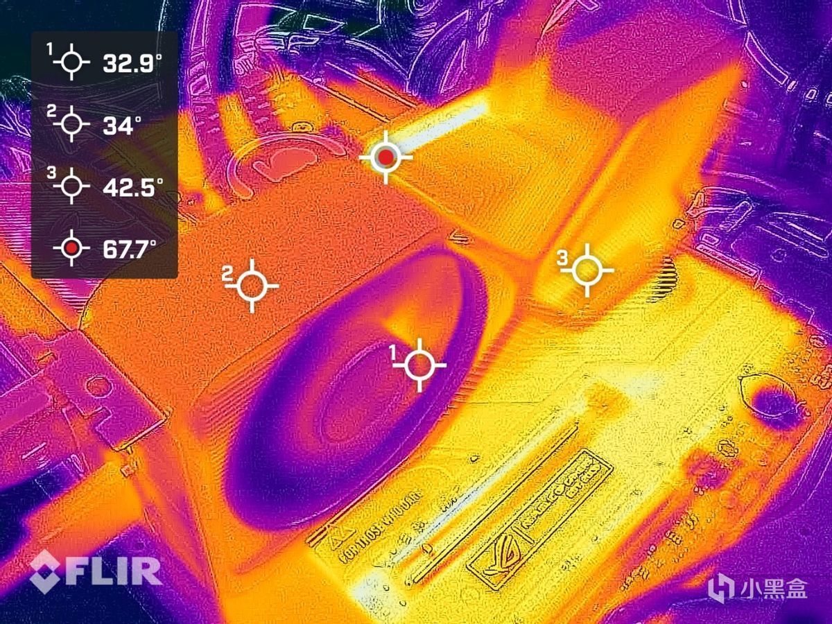 虽然GeForce RTX 4070 SUPER Founders Edition的硬件参数已经接近于RTX 4070 Ti,但TGP仅需要220W,因此在压力测试中GeForce RTX 4070 SUPER Founders Edition的散热模组能够轻松的稳定住GPU和显存的发热量。例如在压力测试下GPU温度最高为68℃,通过红外线测试可以看到GeForce RTX 4070 SUPER Founders Edition表面最高温度在PCB部分,为67.7℃。