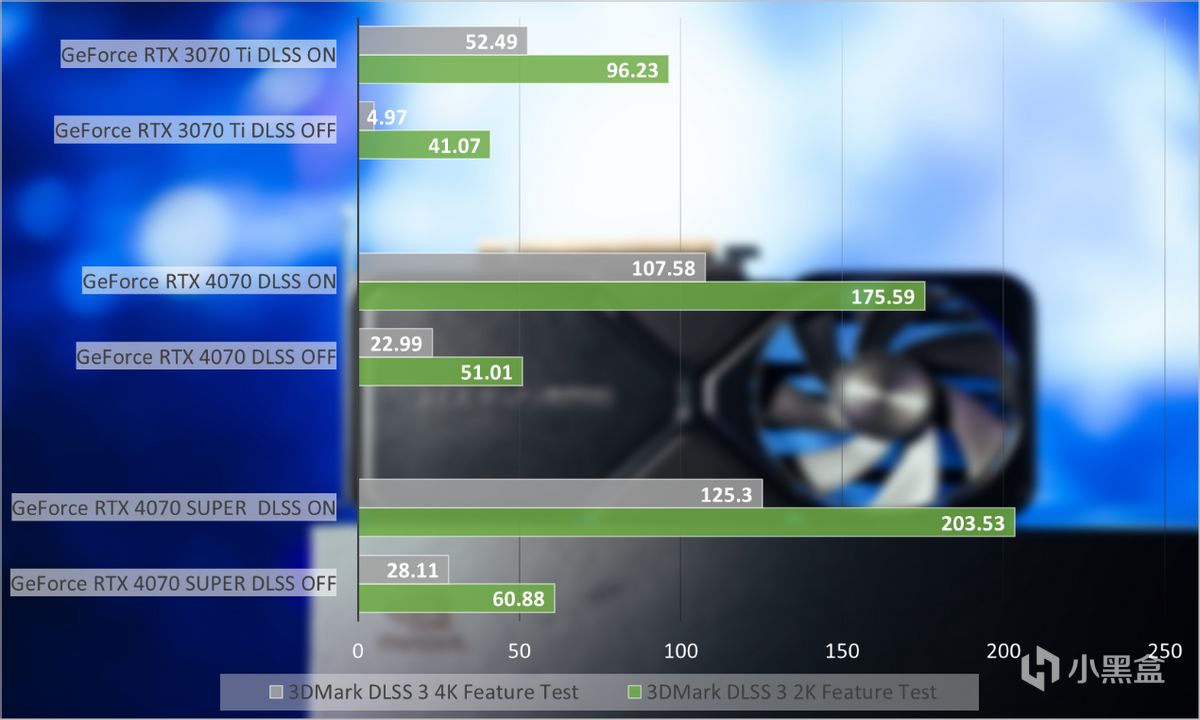 在理论测试中,我们先引用3DMark DLSS 3功能测试作为参考,能够看出GeForce RTX 4070 SUPER的DLSS表现要比GeForce RTX 3070 Ti高出了115%,比GeForce RTX 4070高出了15%。