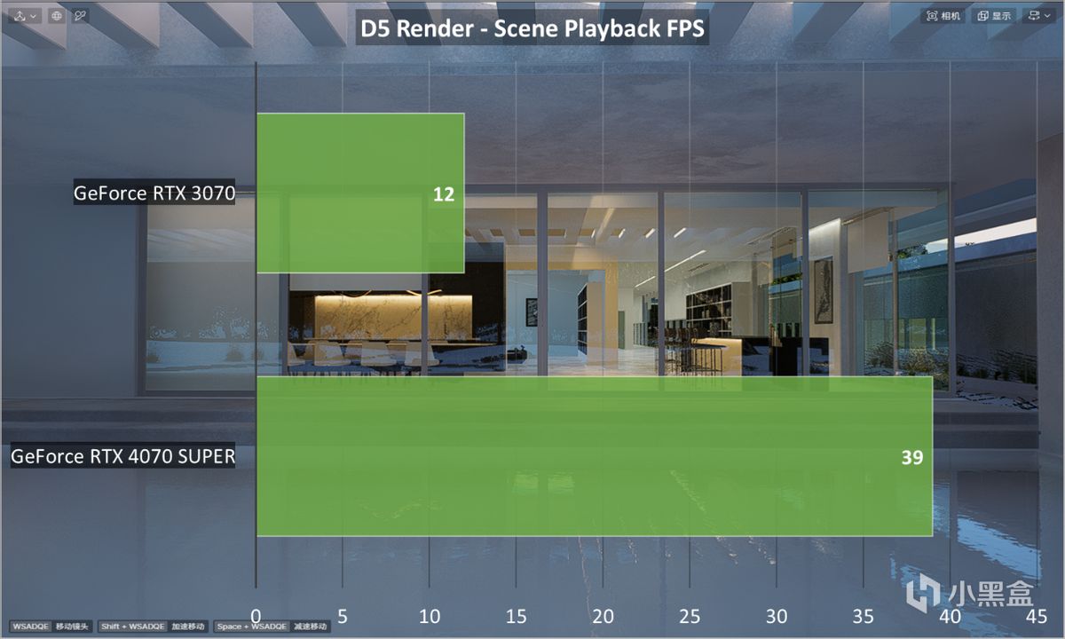 与此同时,D5渲染器的实时帧率在DLSS 3.5加持下得到明显提升,这里用GeForce RTX 4070 SUPER与RTX 3070进行对比,由于RTX 3070不支持帧生成,D5渲染器的场景帧率只有12FPS,但在GeForce RTX 4070 SUPER中,开启DLSS 3.5后帧率提升至将近40FPS,性能提升轻松超过200%了。