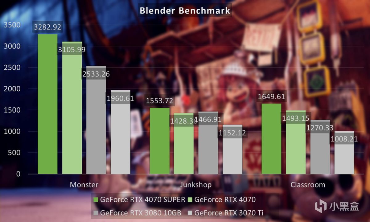 Blender Benchmark主要检测了Moster、Junkshop、Classroom三个输出场景,这里也可以看到GeForce RTX 4070 SUPER提升达到5%左右,相对RTX 3070 Ti提升达到60%以上。