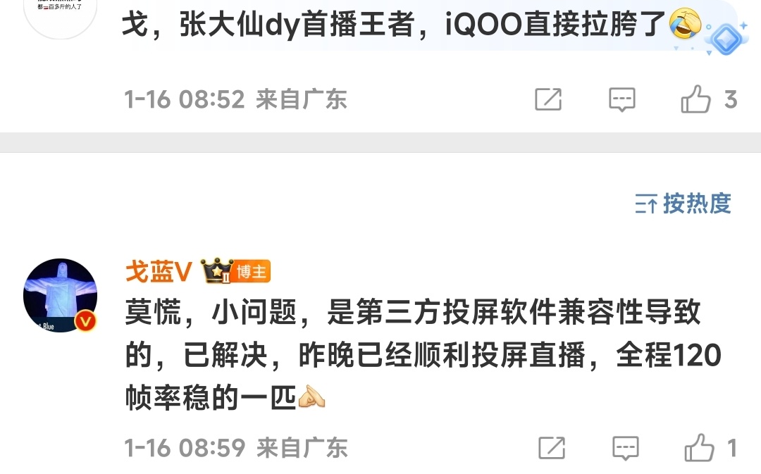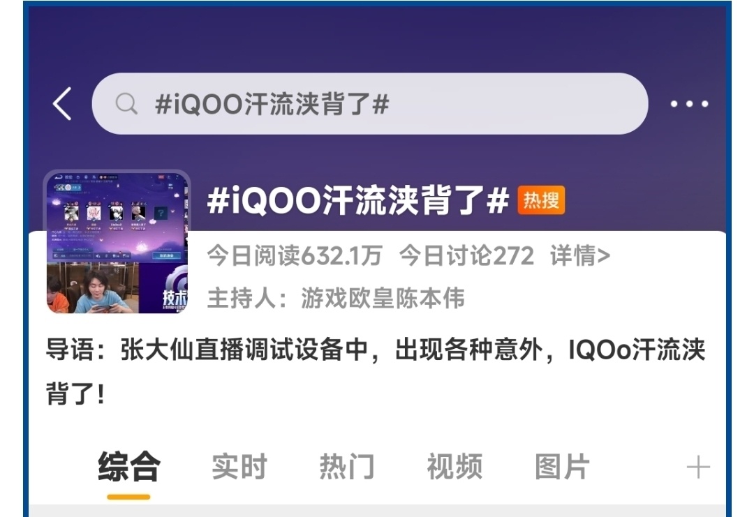 而在用IQOO12進行遊戲投屏直播的時候,張大仙頻繁的出現了熱和燙的問題。有人可能覺得不就是發熱這種小事嗎?可是誰能想到竟然一度登上了熱搜#IQOO汗流浹背了#而且熱搜久居不下。