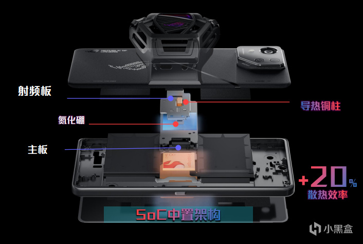 ROG 8 Pro的性能释放无疑是最值得讨论的话题。由于ROG 8 Pro是ROG游戏手机系列首款使用IP68防水的机器,原本的风洞散热设计必须推倒重来。ROG团队的做法很有旗舰笔记本的设计思路。他们先将第三代骁龙8 SoC中置于机身正中央,配以氮化硼覆盖,再用导热铜柱传递给覆盖整个机身背面的石墨烯扩大散热面积。而散热铜柱的加入,进一步让散热效率提升了20%。