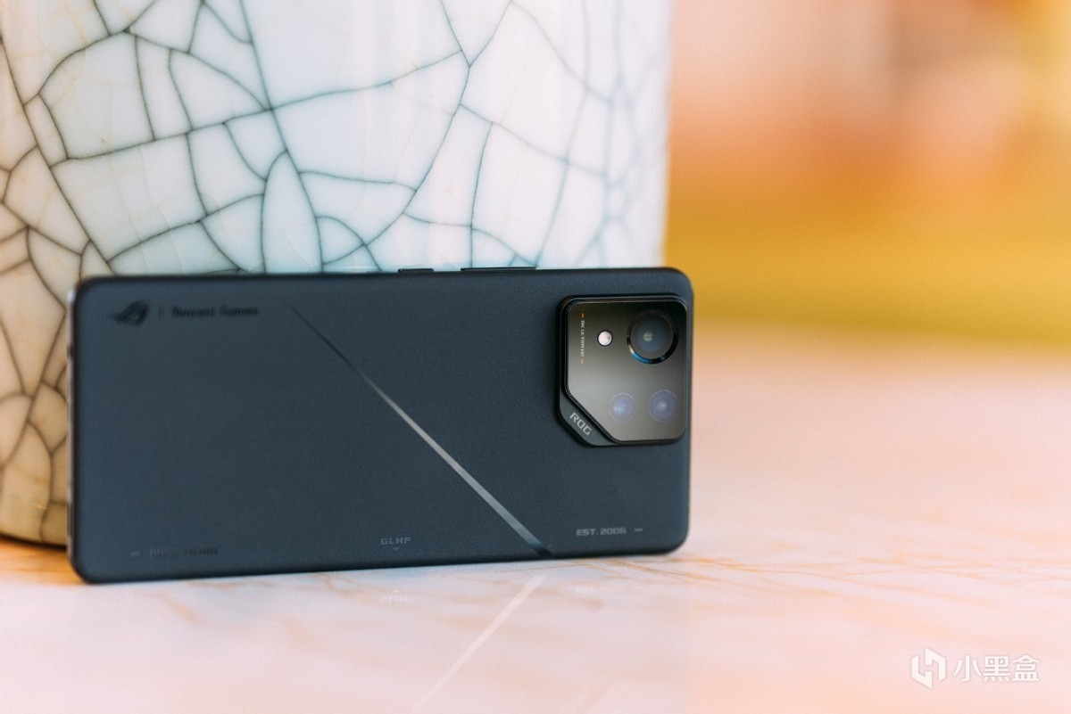 曜石黑的配色和去RGB的设计让ROG 8 Pro显得低调沉稳,但不同于普通版设计,ROG 8 Pro仍会在边缘的ROG和Tencent Games Logo与横跨背面的装饰条使用了会反光的高亮设计,配合放大镜头模组下方的ROG Logo,让手机看起来就很不简单。