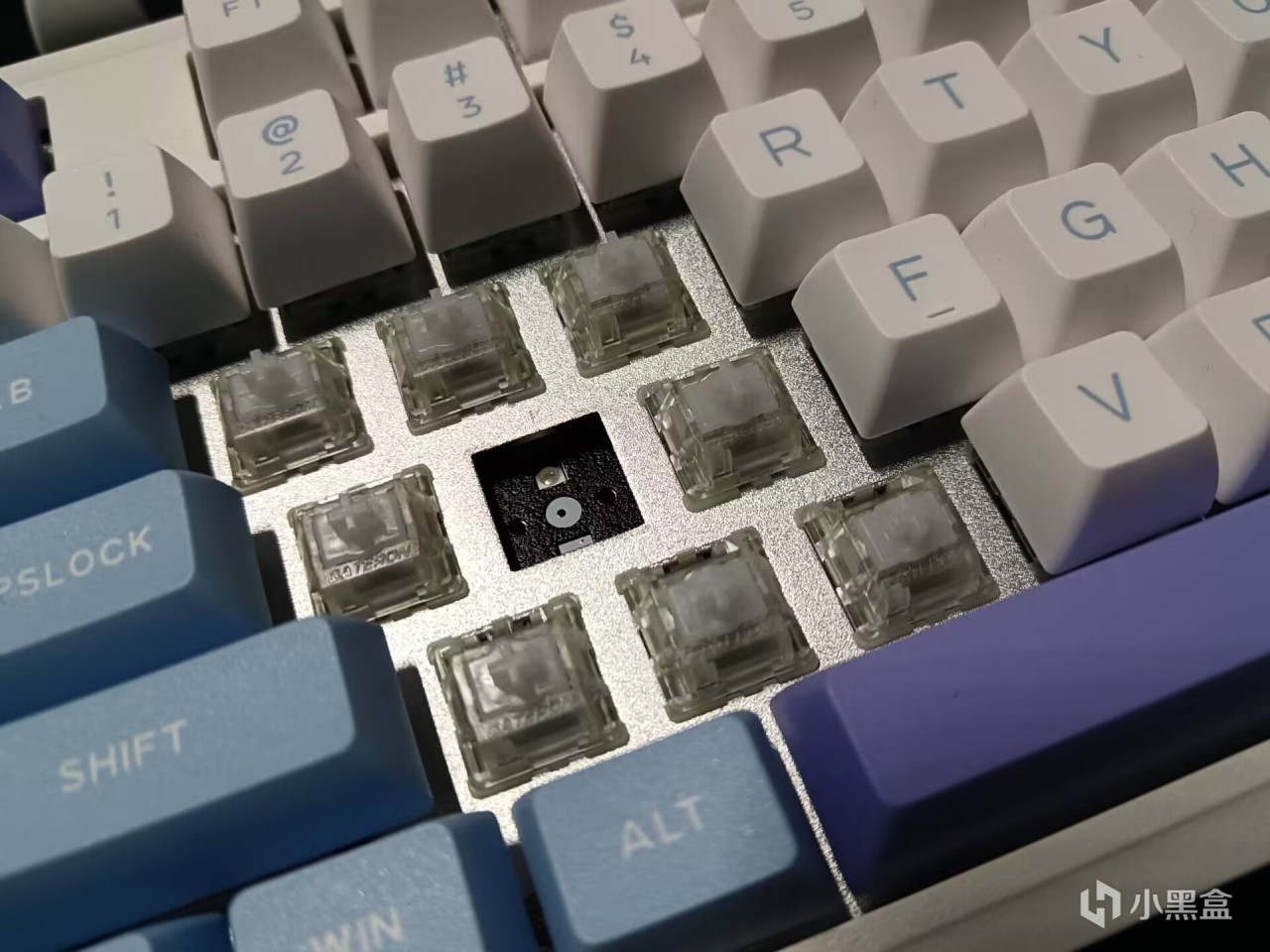 因为产品特性,所以磁轴基本上就告别Gasket结构了,这次的杜伽K100磁白轴版采用了铝定位板,上灯位,内部填充是夹心硅胶+IXPE轴下垫+PORON底棉,整体的触感和声音倒是没我想象的那么烂,也是很不错的水平了。